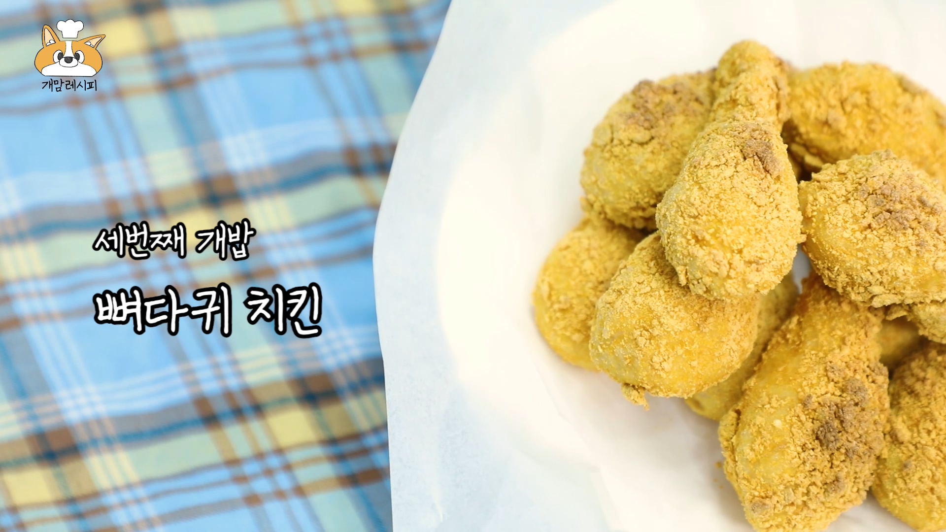 뼈치킨인데 뼈는 실제로 없고 모양만 비슷하게 만들어 줄 예정입니다. 강아지에게 실제 닭뼈가 좋지 않다는 건 잘 알려진 사실이기도 하죠.