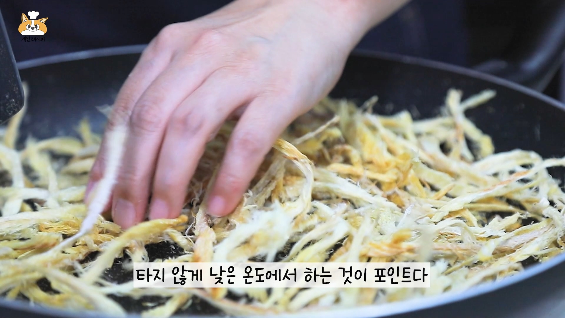 황태채를 이용해 돈까스의 빵가루를 표현합니다. 황태채는 저염 제품을 사용하면 좋은데요, 이미 건조된 것이지만, 프라이팬에 덖듯이 볶아 수분기를 날려주고 손으로 비벼 가루를 냅니다. 제법 빵가루 비주얼이 나와요.