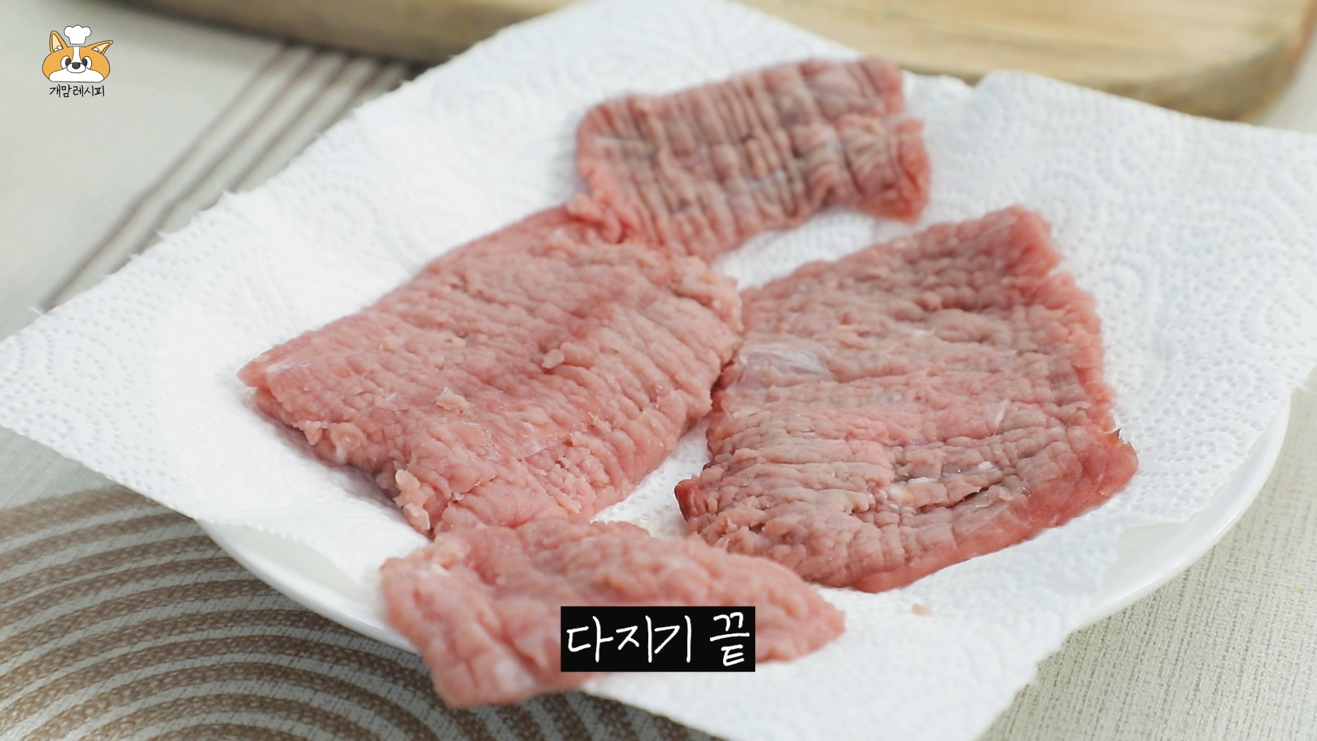 고기는 홍두깨살을 이용합니다. 기름이 적고 결대로 갈라져서 장조림으로도 많이 사용하는 부위인데요, 강아지를 위해 선택했답니다. 고기 다짐용 망치가 없다면 영상 처럼 칼등을 이용해서 고기를 다져서 펼쳐주세요. 안전에 유의하며 작업해주세요.