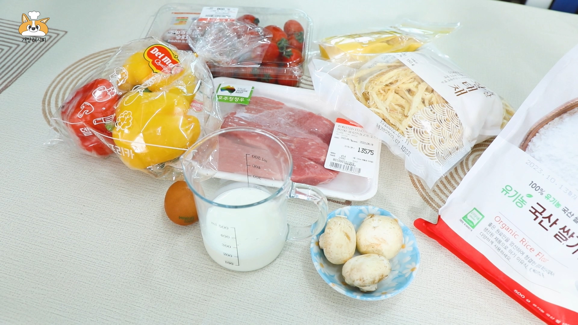 오븐에 굽는 동안 소스도 만들어봅니다. 소스는 방울토마토, 파프리카, 락토프리 우유를 이용해서 붉은 색이 나는 먹음직스런 색깔의 소스로 만들었습니다. 양송이 버섯까지 넣어서 조리하니 그럴듯 하네요~