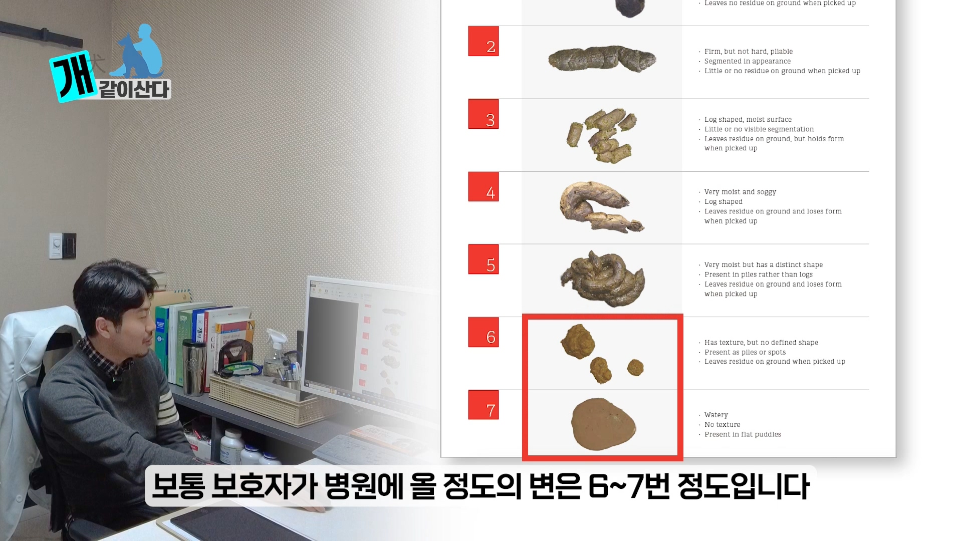 병원에서 강아지 똥의 상태?를 설명하기가 어렵잖아요? 그래서 특수한 질감별? 표가 있더라고요, 그것에 따라 구분해서 강아지 변의 상태를 선생님께 말씀드리면 되는데, 6~7단계에 해당하는 묽은 똥(설사)의 경우에 지켜보다가 호전이 안되면 병원에 방문하면 된다고 해요. 보통 보호자분들이 그 단계에서 병원을 많이 찾으신다고 해요.