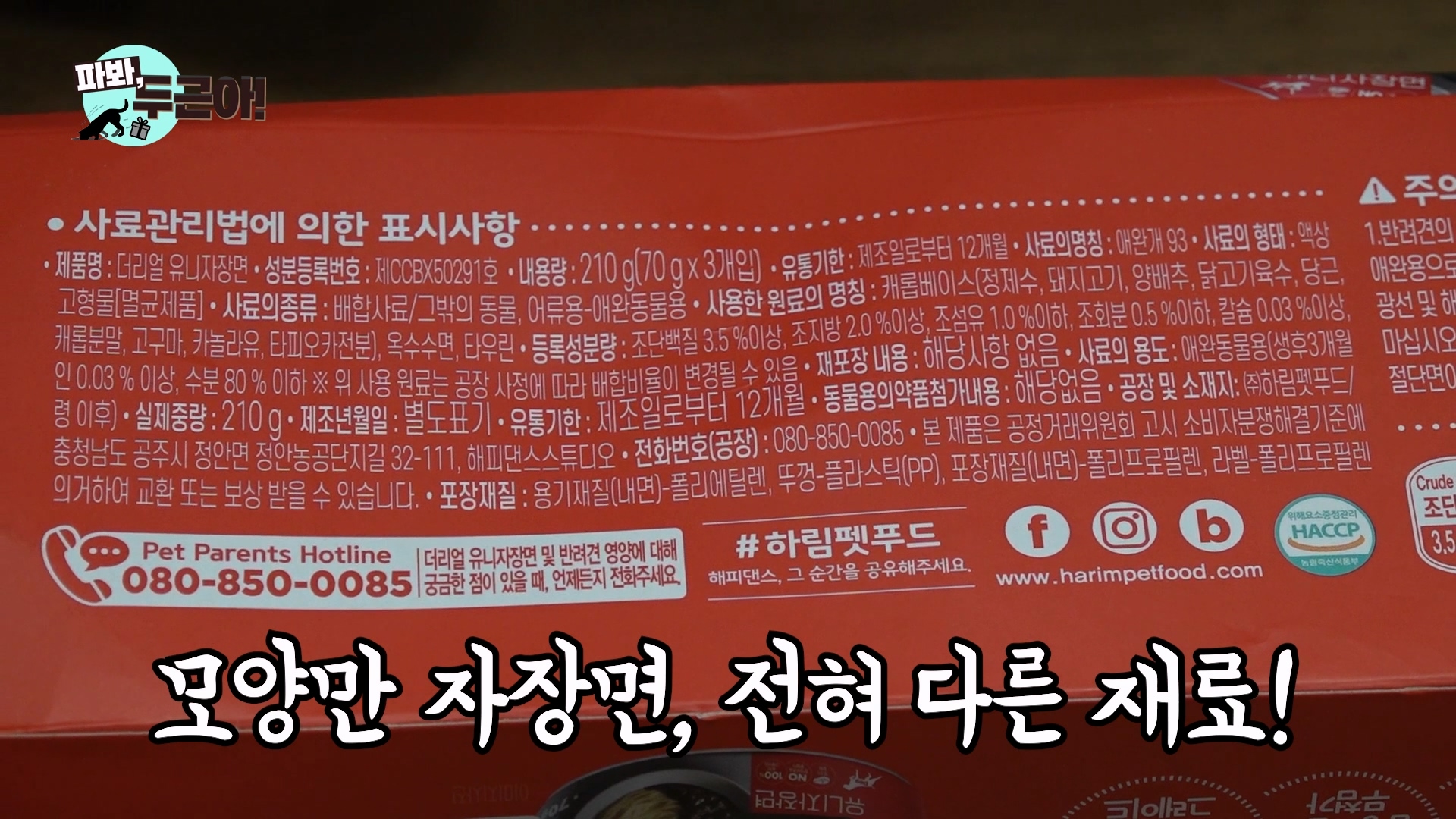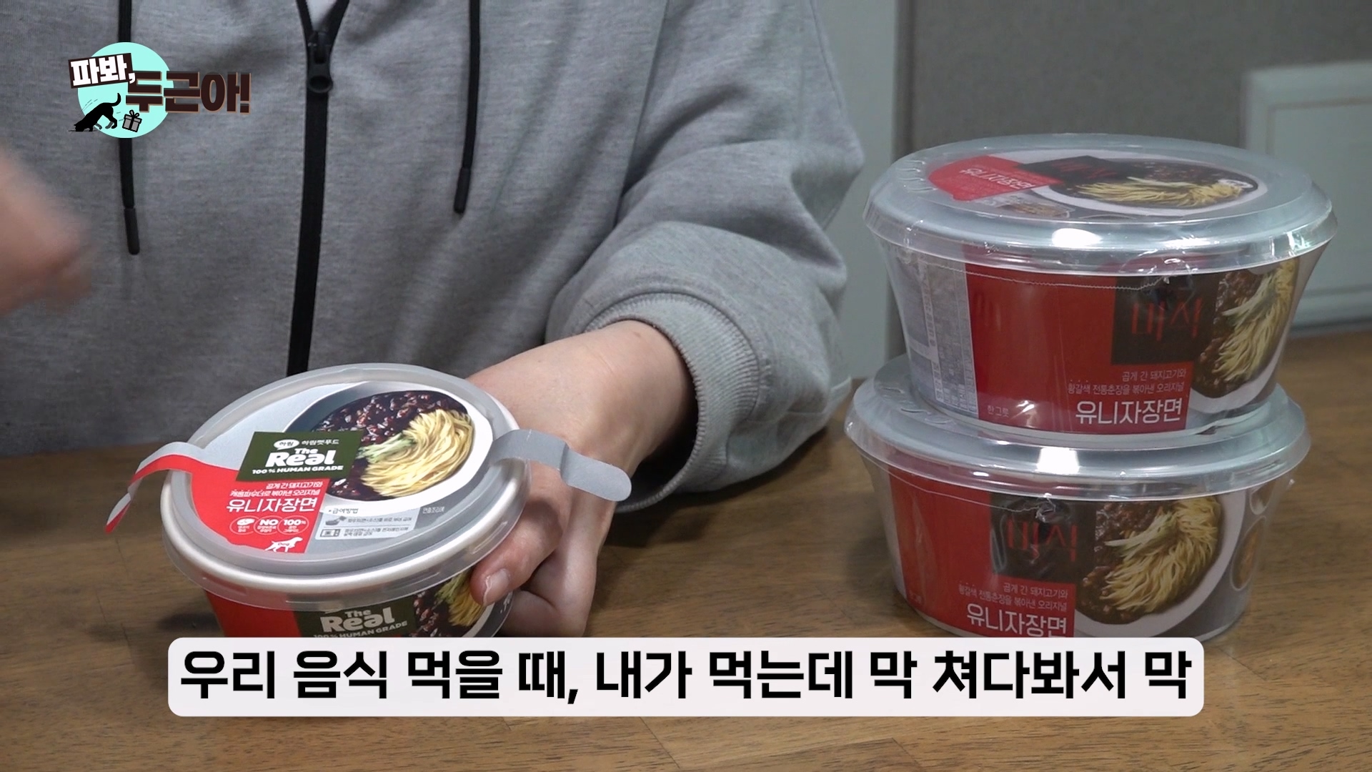 개맘이 맛있게 먹던 자장면은 더미식 유니자장면으로 사람이 먹는 짜장면이었고요, 비슷한 디자인의 콜라보 제품 같아 보이는 하림펫푸드 더리얼 유니자장면은 강아지 전용으로 비슷하게 생겼지만 전혀 다른 강아지 전용 식품입니다.