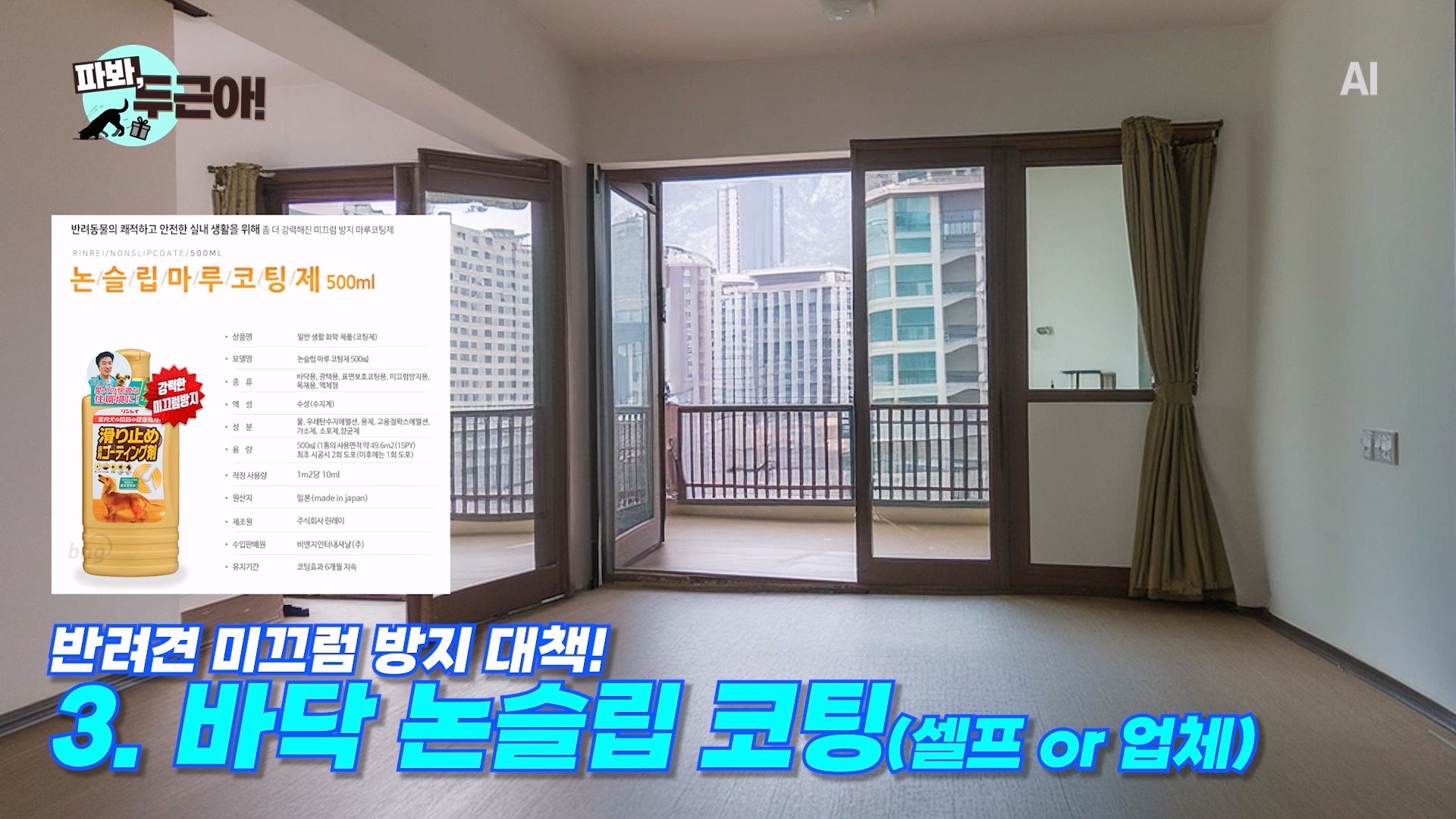 세 번째는 셀프 논슬립 코팅인데요, 마루나 장판에 직접 발라서 마찰력을 올려주는 제품이에요. 일본 제품인데 유명하더라고요 마찰력 단계에 따라 가격이 만원 중반대 것이 있고, 7만원 대 제품도 있어요. 근데 후기를 보면 강아지가 오줌을 누거나 하면 자국이 남고 잘 벗겨진다는 얘기가 있어요. 6개월 마다 추가 코팅을 해줘야하고, 빛에 반사되면 지저분한 자국이 보이기도 한다고 해요... 효과 잘 보고있다는 분들도 계셔서 고민했던 제품... 아예 전문 업체에 장판 코팅 시공을 맡기는 경우가 더 나은 것 같긴 한데 좀 비싼 대신 마찰력 올려주는 미세 입자들도 같이 코팅해준다고 해서 아무튼 그것도 꽤 괜찮은 방법 같더라고요. 사람이 밟고 지나갈때는 큰 느낌 없이 불편하지 않게 코팅된다고 합니다.