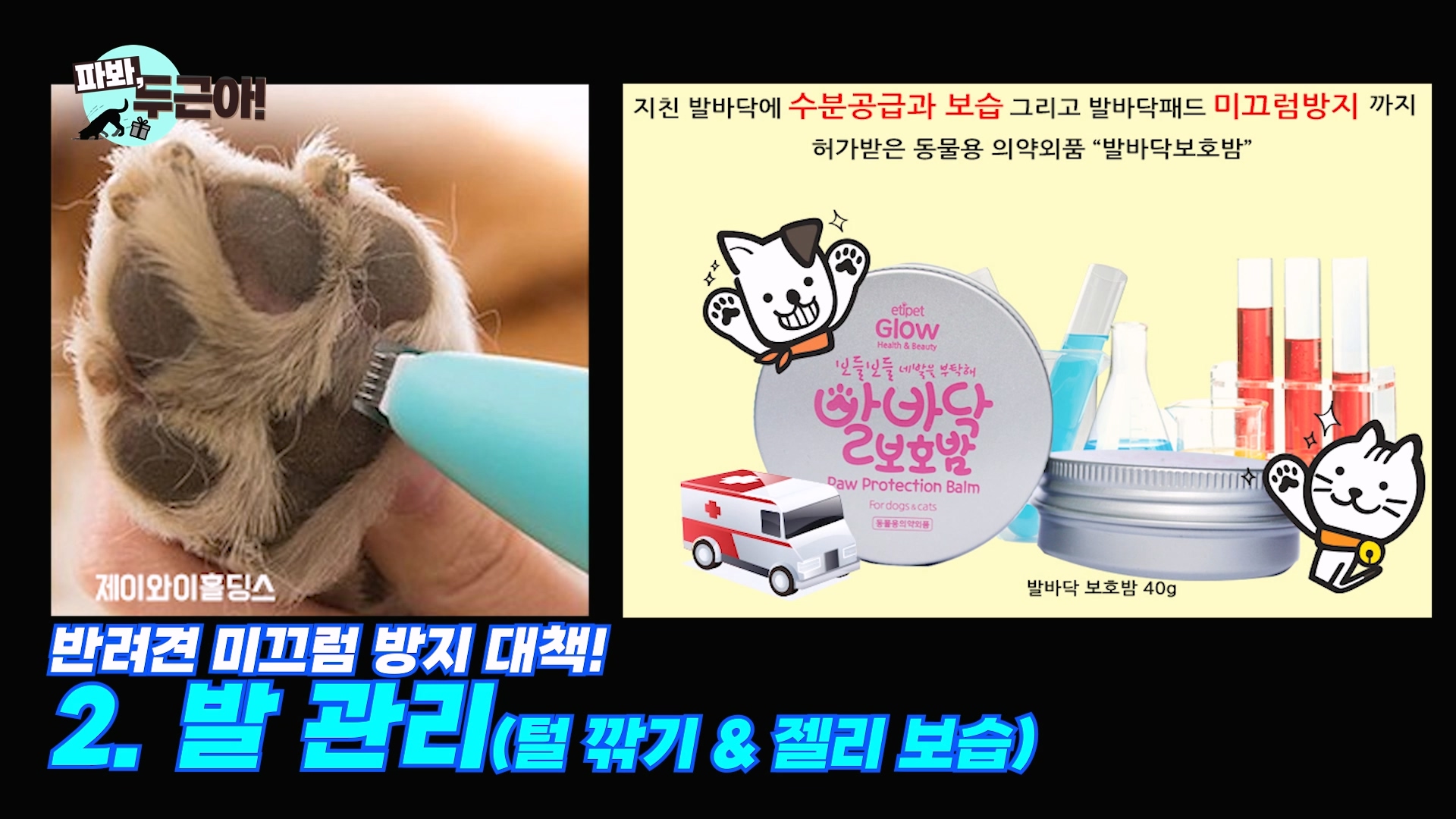 두 번째는 발 관리를 잘 해서 젤리 자체의 마찰력을 높여주는 건데요, 발바닥 털을 잘 잘라주고, 발바닥 보호 밤을 발라줘서 마찰력을 유지시켜주는 방법도 있었어요.