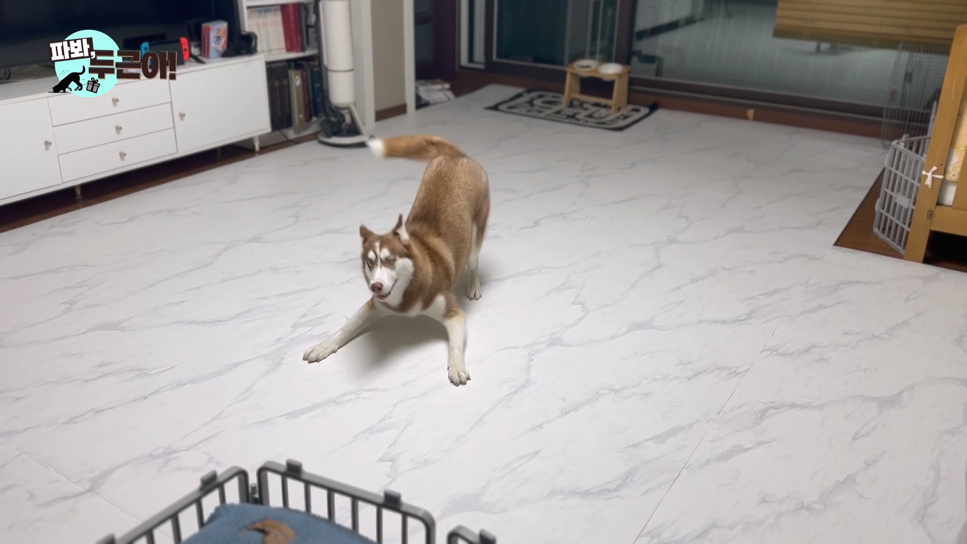 원래 더 어렸을때는 터그놀이하는 걸 정말 좋아했던 두근이... 이사온 뒤로 바닥이 미끄러워서 물고 버티는 터그 놀이를 잘 안하더라고요. 그런데 이제는 자기도 아는지 터그놀이 꺼내주면 정말 좋아해요. 안 미끄러지는 모습을 보니 뿌듯합니다.