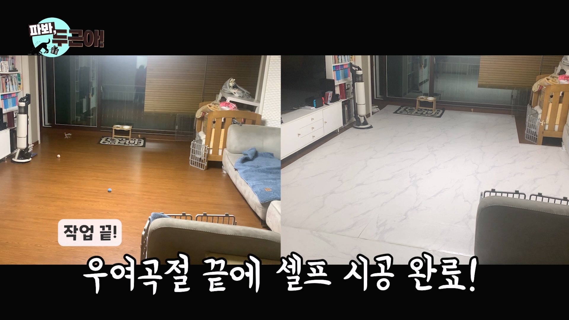 그래서 처음에는 두근이 이름까지 새겨주면서 조각매트를 넓게 깔아보았는데요... 음... 두근이는 저 조각매트 틈을 물고 한장한장 뜯어내더라고요 ㅠㅜ 특히, 이상하게 저 조각매트를 배변판 처럼 생각하는지 쉬야를 자꾸 해서 결국 철거하게 되었답니다. 영상 속에서 자세히 보여드려요... 아쉽긴한데 전혀 생각지 못 한 문제라 참...