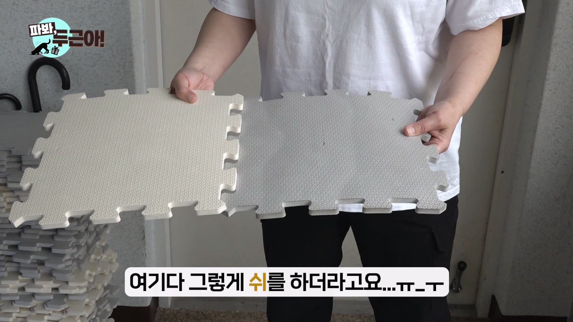 아무튼 미끄럽지 않고 폭신해서 층간소음도 해결되고 성능 자체는 확실히 맘에 드는데, 두근이가 저런 행동을 하게 돼버려서 아쉽기만 해요... 영상 속에서 자세히 보여드려요.