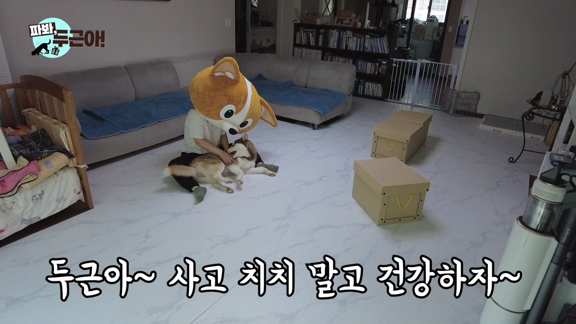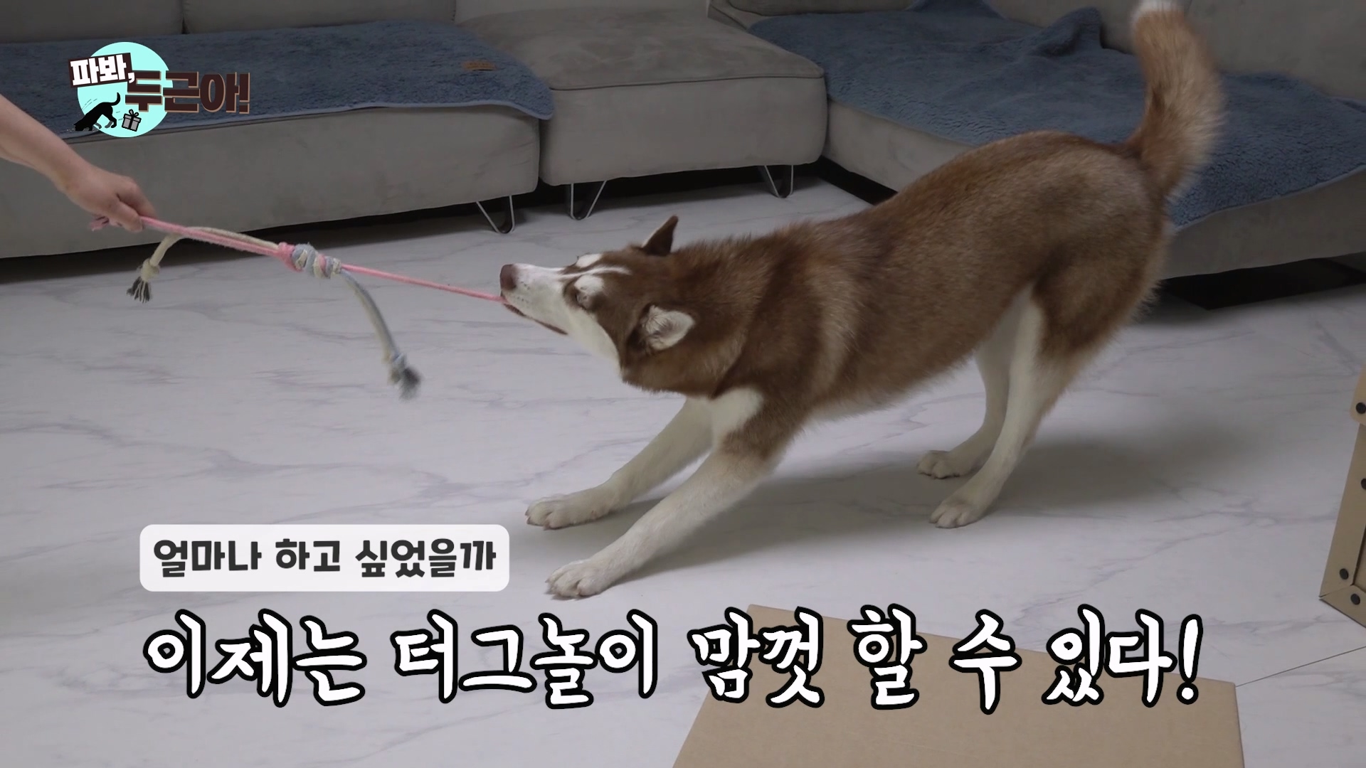 원래 더 어렸을때는 터그놀이하는 걸 정말 좋아했던 두근이... 이사온 뒤로 바닥이 미끄러워서 물고 버티는 터그 놀이를 잘 안하더라고요. 그런데 이제는 자기도 아는지 터그놀이 꺼내주면 정말 좋아해요. 안 미끄러지는 모습을 보니 뿌듯합니다.