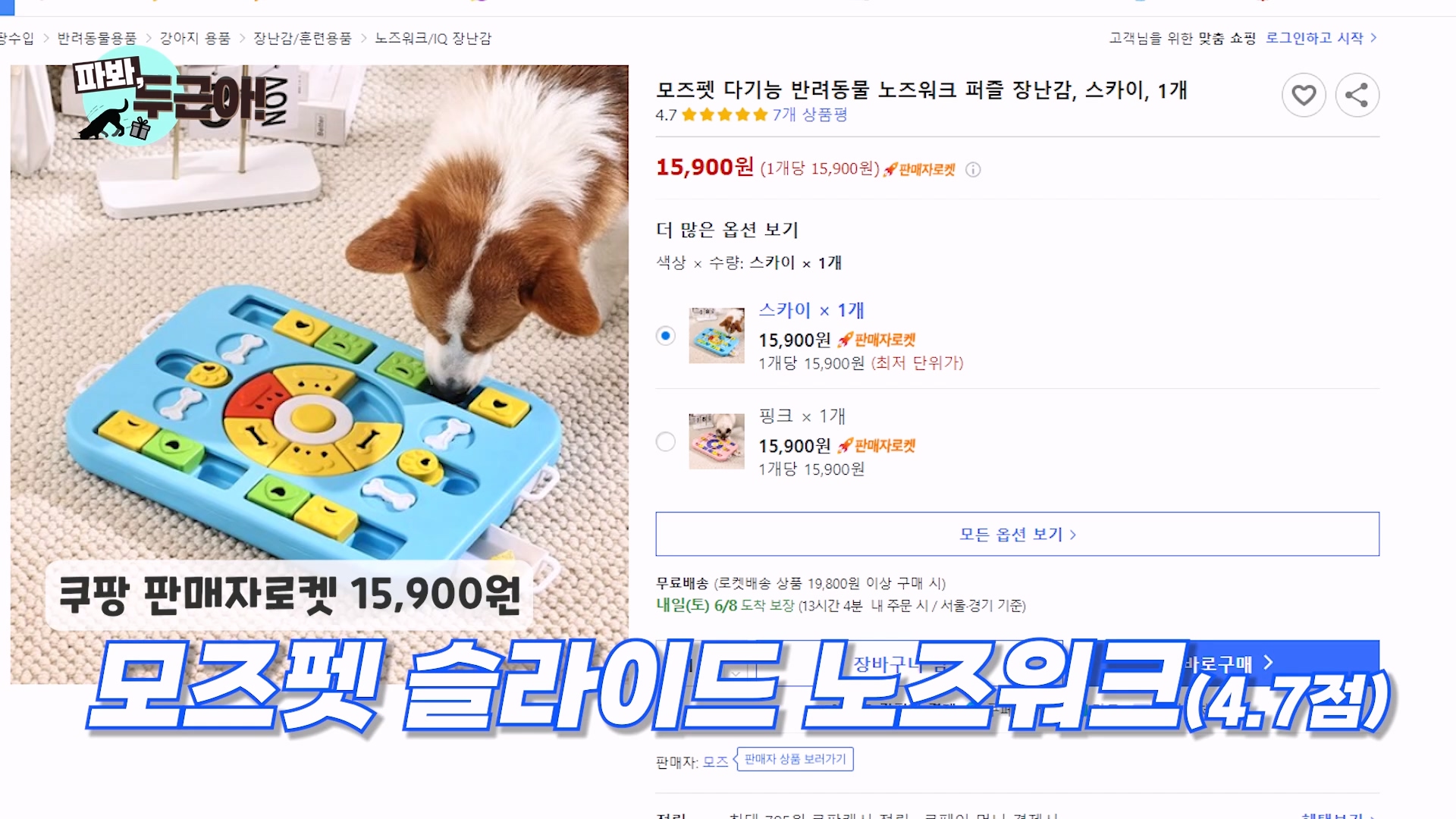 주로 쿠팡을 이용하는 개맘은 모즈펫 다기능 반려동물 노즈워크 퍼즐 장난감... 이라는 긴 제목의 제품을 발견해요. 대형견(두근이는 중형견) 노즈워크를 검색했는데 이 제품이 나왔다고 합니다. 현재 쿠팡에서 15,900원에 판매자로켓으로 판매중이예요. 참고로 이 리뷰는 개맘의 내돈내산 리뷰랍니다. (근데 생각해보니까 허스키 엄마가 왜 웰시코기죠? ㅋㅋㅋ 개맘은 코기사이엔스 종이라나 뭐라나~)