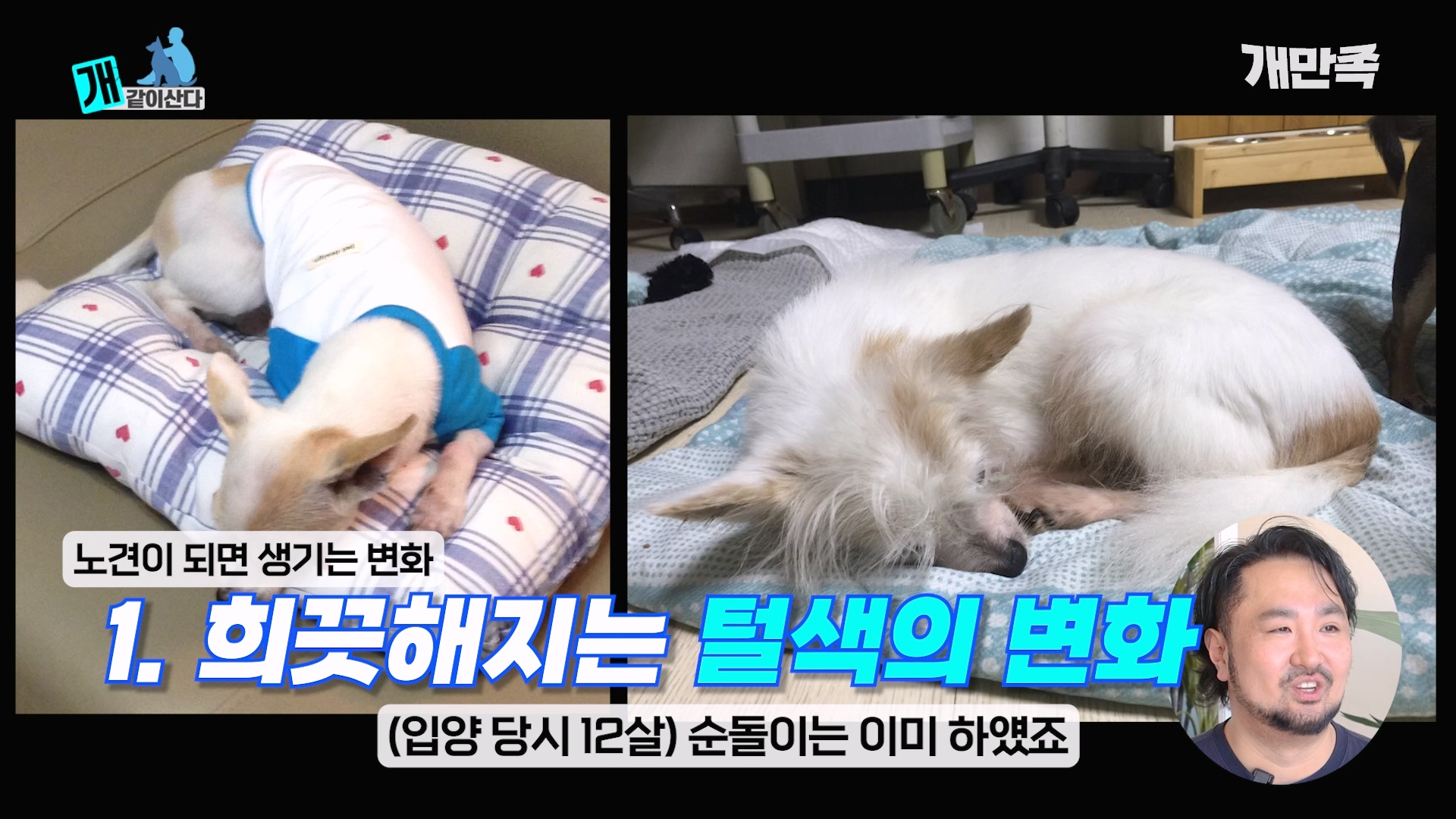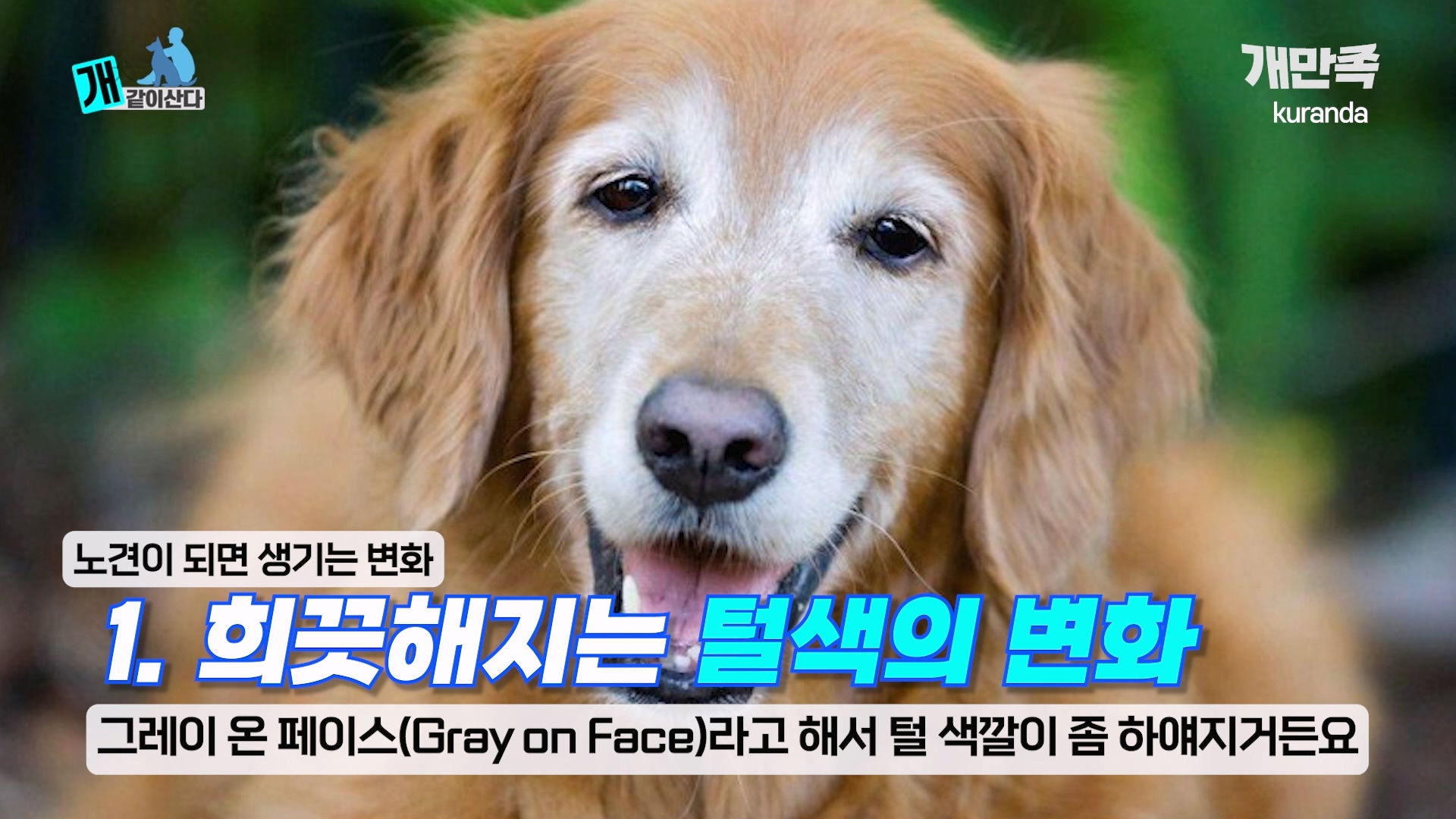 영상 중반 부터는 실질적인 정보들도 많이 소개해주셨어요. 노견이 되면 나타나는 특징인 그레이 온 페이스(얼굴 주변부터 털이 희끗해지는 변화)와 이빨이 빠지는 증상에 대해서 알려주셨고